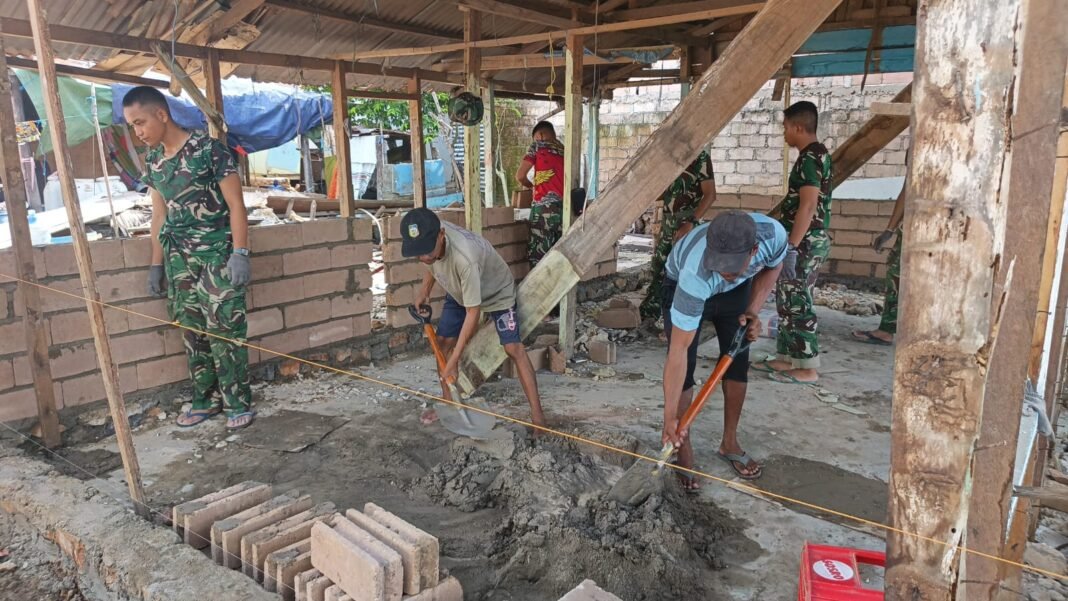 Kendari – Satuan Tugas (Satgas) TMMD ke-127 Kodim 1417/Kendari terus berusaha mempercepat pengerjaan proyek Rumah Tidak Layak Huni (RTLH) di Kelurahan Petoaha pada Minggu (22/2). TNI dan masyarakat setempat bekerjasama di titik sasaran ke-3 untuk melanjutkan pendirian dinding rumah. Proses pembangunan ini dilakukan dengan pengaturan material secara bertahap dan teliti guna menjamin kekokohan dan keamanan konstruksi.