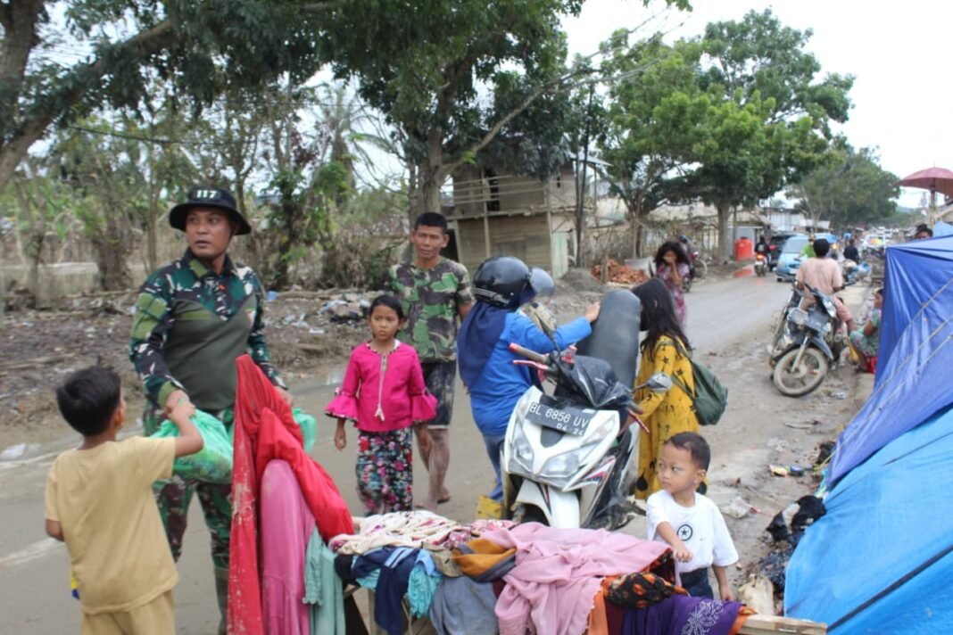 Kegiatan tersebut dilaksanakan dengan membagikan kebutuhan pokok kepada masyarakat yang terdampak banjir sebagai bentuk perhatian dan kepedulian TNI terhadap kesulitan yang dialami warga.